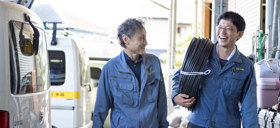 山下さん: 自分が携わった工事が無事に完了、電気が灯って、直接お客さんに喜んでいただけるとき、嬉しく思います。