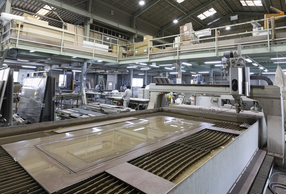 第一工場はトリムス岡山の基盤です。人工大理石製のカウンターに、シンクやガスが取り付けられるように開口を加工するなどの下準備、合板の裏張り、木口の化粧処理などを施し、キッチンカウンター・洗面カウンターの段取りを行います。