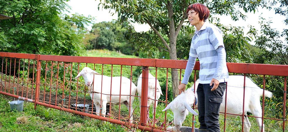ヤギと触れ合う、まほらファームの鈴木妃奈さん