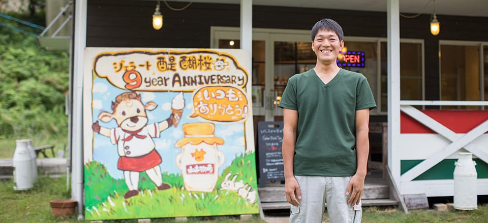 はい。出身は真庭市落合で、高校まで市内の普通科高校に通っていました。そのあとは、大阪の専門学校のペットビジネス科というコースに通いました。高校時代の友達はみんな大学に進学したんですが、自分も大学に行ってまでバリバリ勉強するのか・・?ともやもやしていました。 もともと僕は、「酪農を継げ」というのは一切言われていなかったんです。僕が学生の頃は景気も悪かったし、むしろやるなと言われていたくらいで…。どうせ勉強するなら好きなことに対して全力でのめり込みたいと思っていた矢先、その専門学校を見つけました。 1年生の頃、先輩が校内のトリマーのコンテストで優勝されたのがすごくかっこよくて、僕もそのコンテストに出てみたいと思いました。でも、通っていたコースではトリマーの勉強ができなかったので、先輩に弟子入りして修行して、2年生の時に大会に出場することができました。それがきっかけで、店舗の人に「トリマーのアルバイトに来ないか?」と声を掛けてもらえて、その後、就職までさせていただくことになりました。 5年目ぐらいの頃にチーフになったのですが、そろそろ独立するかと考えていた時期にふらっと地元に帰ったら、親父がすごく楽しそうに酪農の仕事をしてたんです(笑)。しんどい仕事のはずなのですが、実際に見たら笑顔で仕事をしていたのが、大阪に戻ってからもずっと印象に残っていていました。どうも気になるからもう一回地元に帰って、それまで一切何もやったことがなかった両親の酪農の仕事を手伝ってみました。 だんだんと興味が沸いてきて、とりあえず1年ぐらい続けてみたら酪農の方が全然性に合っているし、酪農から派生して何かやりたいなと思っていたらこのジェラートの店をオープンしちゃったし、もう大阪には戻れないなと。そんな感じで今に至ります(笑)。 でも・・・今から考えたら、大阪の専門学校に通っていた間も、どこか頭の片隅に「酪農」というワードが引っかかっていたような気がします。例えば乳製品を使って何か作ってみたいなと、ふわっとした興味レベルでしたが思っていましたね。 |