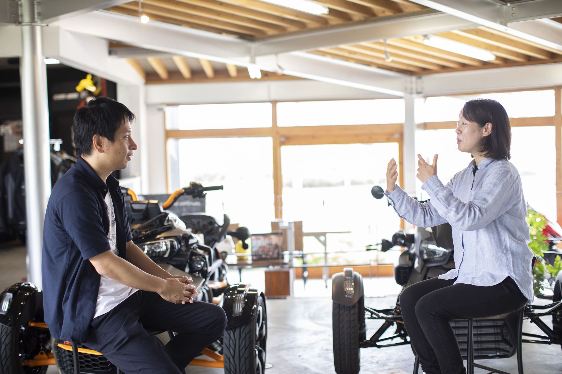 だから「バイクショックなんです!」と⾔いたいんですけど、なかなかできないんですよ。バイクショップなのですが、色々と事業 やっていましてね、みたいな(笑)。 |