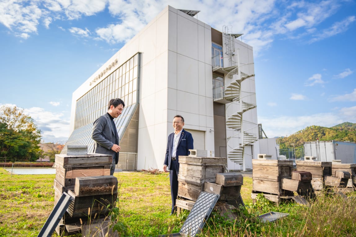 山田養蜂場の本社敷地。みつばち健康科学研究所棟の側に並ぶ蜂の巣箱。 | |