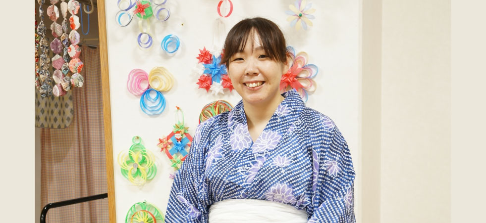 介護の仕事は、利用者さんの状態が常に変わる中で様々なことを想定しながら行動する必要があり、大変な面もありま す。でも、「ありがとう」と言ってもらえるたびに「やってよかっ た」と実感でき、そのたびやりがいを感じます。おじいちゃん・ おばあちゃんが好き、人と関わるのが好き、人の役に立つ仕事をしたい方には、ぜひ挑戦してほしいお仕事です。