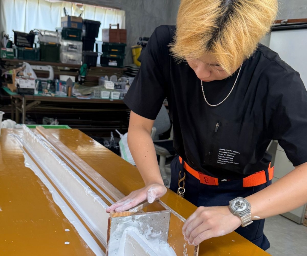 現在、建物の装飾性や耐久性を高める左官の技能を競う「技能五輪全国大会(左官競技)」に向けて練習を重ねています。「石膏置き引き」や「軽量鉄骨」、「ボード加工」など、現代の現場ではあまり触れることのない作業が中心になるので、毎日が学びの連続です。外部講師から指導を受けたり、社長と相談しながら技術を磨いています。作業時間が決められているので効率良く動くことを心がけています。「石膏置き引き」が綺麗に引けたり、寸法通りに加工ができたときにやりがいを感じます。