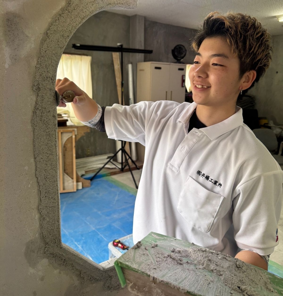 専門学校在学中に先生から紹介してもらったのがきっかけです。井場工業所では、福利厚生が充実していること、その他の手厚いサポートを魅力に感じ入社を決めました。実際に働いてみると職人さんは優しく面白い方ばかりで、昔ながらの「見て覚えろ」ではなく、時には厳しくも、丁寧に指導してくださいます。左官は経験が大切な仕事なので、一生勉強という部分が大変さでもあり、面白さでもあると感じています。